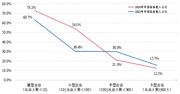 從企業(yè)規(guī)模看,大、中、小、微型企業(yè)年營業(yè)收入占被調查企業(yè)總營收的比例分別為86.2%、9.3%、4.5%和0.1%,大型企業(yè)數量最少,但對環(huán)??偁I收的貢獻最大,小微企業(yè)數量較多,但產出貢獻較小。根據統(tǒng)計結果,統(tǒng)計范圍內企業(yè)營業(yè)收入總額約563.96億元,其中環(huán)保業(yè)務營業(yè)收入約85.80億元,在總營業(yè)收入中占比15.2%。從企業(yè)類型看,2024年大、中、小、微型企業(yè)環(huán)保業(yè)務收入占對應類別年營收總額比重分別為12.5%、21.3%、54.1%和74.7%,2023年相同指標分別為15.7%、30.0%、30.4%和63.7%。由此可見,