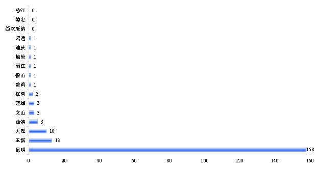 統(tǒng)計范圍內的200家環(huán)保企業(yè)地域分布高度集中,滇中城市群聚集了調查范圍內90.5%的企業(yè),共計181家,主要分布在昆明、玉溪、楚雄、曲靖四座城市,其中昆明環(huán)保企業(yè)158家,占統(tǒng)計企業(yè)總數的79.0%。
