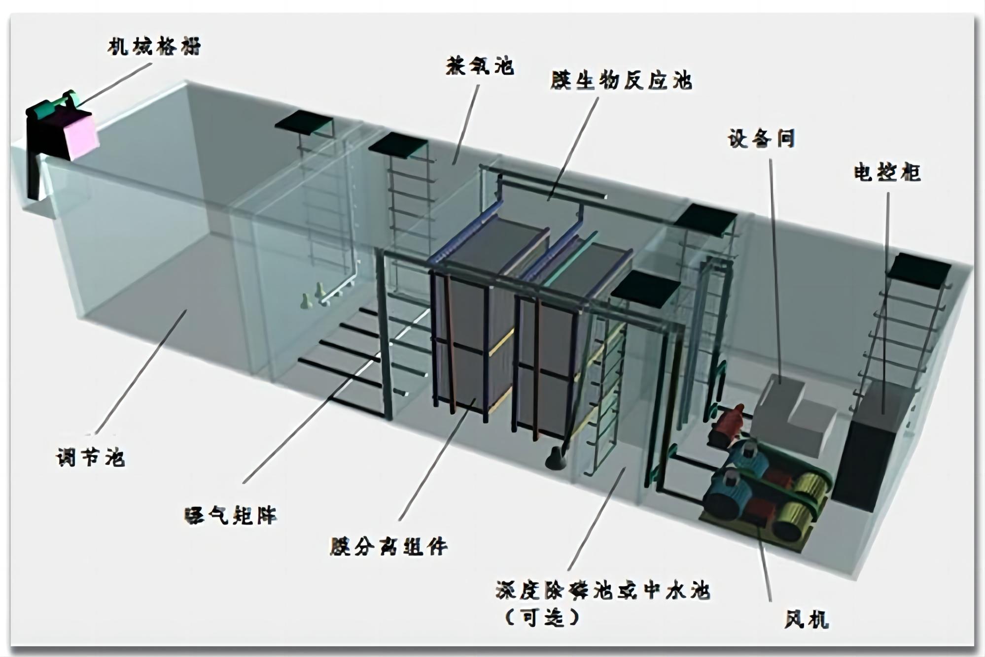 工藝原理:膜生物反應(yīng)器(MBR)工藝主要由兼氧池、MBR膜生物反應(yīng)池、深度除磷池等部分組成。通過(guò)好氧、厭氧菌的分解作用、中空纖維膜的截留作用、強(qiáng)化除磷填料的吸附作用等實(shí)現(xiàn)中水回用或達(dá)標(biāo)排放。