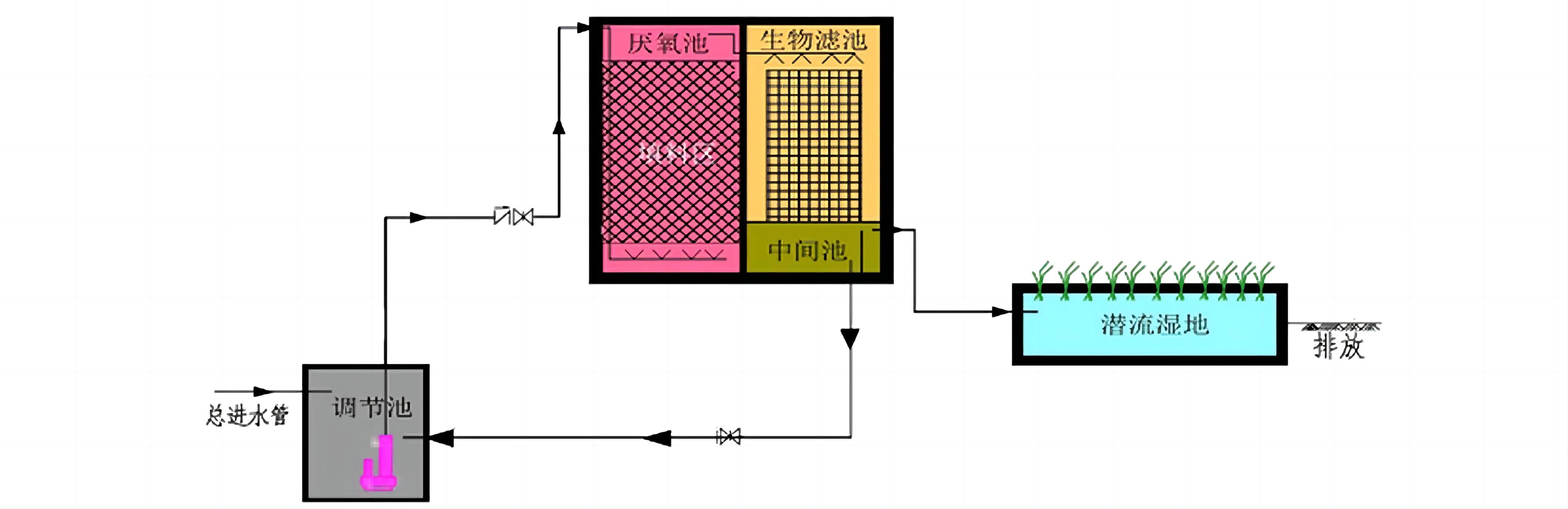 工藝原理∶模塊化分層生物滴濾池屬于生物膜法污水處理工藝范疇,主要由集水池、復合濾床、中間池、人工濕地等部分組成。通過特殊強化濾料進行生物和生態(tài)處理實現(xiàn)污水達標處理。